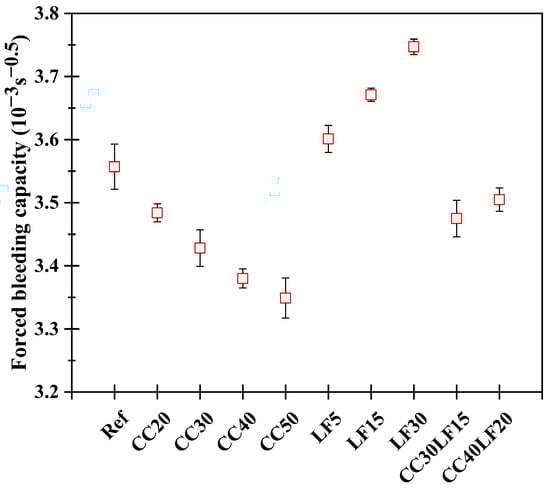 The effect of the CC and LF content and their combinations on the water retention ability is shown in Figure 6. The highest and lowest forced bleeding capacity corresponded to the binary systems containing 30% LF and 50% CC, respectively. It can be concluded that the CC addition increased the water retention ability of the paste mixtures made with the blend binders, while the LF negatively affected it. Hatch et al. [30] noted that clay minerals, particularly the kaolinite utilized in this study, exhibited a high capacity for water adsorption due to the uptake of water within their interlayer spaces. On the other hand, the micro-filling effect resulting from the addition of LF can release water trapped between cement particles, thereby diminishing the water retention capacity of binary systems. Additionally, ternary binders incorporating both CC and LF exhibited reduced forced bleeding capacities; moreover, the CC30LF15 binder showed superior water retention compared to the CC40LF20 binder. This shows that the adverse effect of LF outweighed the water uptake capacity of the CC particles.