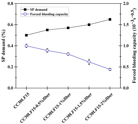 SP demand and forced bleeding capacity of mortars with varying fiber contents.
