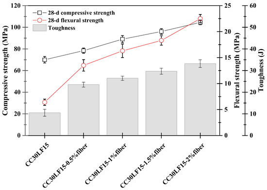 Figure 8 illustrates the influence of the volume fraction of fiber on the 28-day mechanical properties of fiber-reinforced mortars made with the optimized CC30LF15 binder. A significant contribution of the steel fiber on hardened mechanical properties could be observed, most notably in the flexural strength. The 2% fiber addition led to 43%, 275%, and 240% increases in the 28-day compressive and flexural strengths and toughness, respectively. The presence of steel fibers can constrain lateral deformation under compression loads; moreover, the strong physical bonding between the fiber and density matrix can provide support. In addition, the increased flexural strength and toughness can be explained by the strain-hardening behavior induced by the fiber-bridging effect [32]. Mechanical fiber interlock, frictional sliding between fiber–matrix interfaces, and fiber debonding will contribute to the energy dissipation under loads and thus the toughness [31]. Therefore, the 2% steel fiber with optimal mechanical and moderate fresh properties was selected for further evaluation.