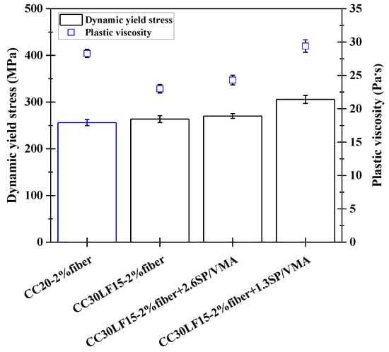 The dynamic rheological properties (i.e., dynamic yield stress and plastic viscosity) of the investigated fiber-reinforced mortars are shown in Figure 9. It should be noted that the SP dosage was varied for two different binder systems as the constant slump flow of 170 ± 10 mm after 25 jolts was maintained. Therefore, the dynamic yield stress values of the CC20 and CC30LF15 fiber-reinforced mortars were more or less the same, as shown in Figure 9. However, the plastic viscosity of the mortar made with the CC20 binder was significantly higher than that of the mortar with the CC30LF15 binder. This was consistent with the results of the flow characteristics in Section 3.1. The enhanced packing density, attributed to the micro-filling effect of the LF, led to an increase in the availability of water molecules acting as lubricants, which in turn decreased the viscous dissipation and thus the viscosity. On the other hand, adding VMA while maintaining the same SP dosage resulted in a rise in both the dynamic yield stress and plastic viscosity. For instance, the CC30LF15-2%fiber+1.3SP/VMA mortar exhibited the highest values of 306 Pa and 29 Pa·s, respectively, which was increased by 16% and 28% compared to the CC30LF15 fiber-reinforced mortar without any VMA. Without competing absorption that can interfere with the effect of VMA resulting from the extra SP dosage, the addition of high molecular weight VMA is capable of effectively trapping water within the pore solution [33], thereby resulting in an increase in viscosity.