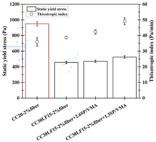 Figure 10 illustrates the static rheological properties (i.e., static yield stress at 5 min and thixotropic index from 5 to 30 min) of the investigated fiber-reinforced mortars. The initial offset in static yield stress observed in the mortar was primarily attributed to the network formation resulting from particle colloidal flocculation, considering the negligible impact of very early-age hydration after mixing such as 5 min [34]. The CC20 fiber-reinforced mortar showed the highest static yield stress, indicating pronounced particle flocculation. This suggests that a significant number of flocs formed, particularly in the absence of the LF. Moreover, the intrinsic layered particle structure of the CC resulted in a high water demand and increased flocculation. Muzenda et al. [29] reported that the CC was identified as a critical factor that enhanced plastic viscosity and static and dynamic yield stress, while the LF, even in smaller quantities, tended to mitigate these rheological properties slightly, thus helping adjust the workability. In addition, the addition of VMA led to an increase in static yield stress. This can be attributed to the long polymer chains in the VMA, which can entangle each other, forming a relatively robust network [33].