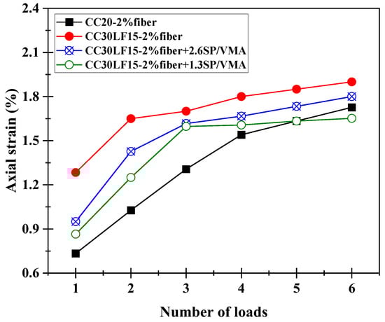 The axial strains of the investigated fiber-reinforced mortars under incremental loads corresponding to the resting period of 5, 10, 15, 20, 25, and 30 min are shown in Figure 11. The CC20 fiber-reinforced mortar exhibited the lowest strain of 0.7% when weight was added at 5 min, aligning with the findings of the highest static yield stress observed. The significant colloidal flocculation exhibited by the CC20 binder enhanced its weight resistance capacity, which is particularly crucial at the beginning of printing layers. This helps present plastic collapse failure due to the inadequate yield strength, thereby improving buildability. Moreover, the incorporation of VMA also contributed to lower axial strains. When the SP/VMA ratio was decreased from 2.6 to 1.3, there was a noticeable reduction in axial strains by 26% and 33% at 5 min, in comparison to the CC30LF15 fiber-reinforced mortar that did not contain any VMA. With the number of loads increasing at 5-min intervals, the rate at which axial strains increased in the CC30LF15 fiber-reinforced mortar containing VMA was significantly lower compared to the CC20 fiber-reinforced mortar. This reflects the higher Athix resulting from the addition of VMA, which provided greater yield stress for the printed filament over time, enabling it to withstand more weight from the upper layers for up to 30 min. For instance, the CC30LF15 fiber-reinforced mortar incorporating a SP/VMA ratio of 1.3 showed the lowest axial strain at 30 min, which decreased by 13% compared to the pure CC30LF15 fiber-reinforced mortar.