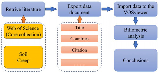 To track the developmental trends of soil creep, this study employed bibliometric methods to statistically and visually analyse the relevant literature published in recent years. The specific research process is depicted in Figure 1. Firstly, the literature searches were conducted in the Web of Science Core Collection database targeting this field, and the search results were exported as text files. Subsequently, bibliometric analysis was conducted on the exported literature information using visualization software (VOSviewer) to uncover the primary research directions, hotspots, and trends in the study of soil creep and constitutive models.