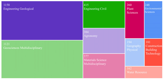 The literature data were sourced from the Web of Science Core Collection database. The literature retrieval was conducted using the “all fields” method, and included keywords such as “creep” and “soil”. The cut-off date was 25 March 2024, resulting in the retrieval of a total of 3907 documents. The main research fields included Engineering Geological, Geosciences Multidisciplinary, and Engineering Civil, among others. The specific number of papers in the main research fields is shown in Figure 2. Subsequently, all the information of the literature was exported in text document format for scientific bibliometric analysis.
