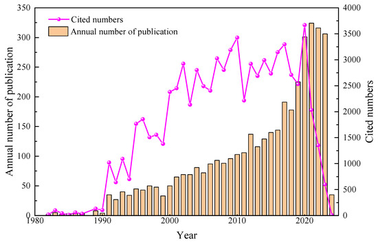 As of 25 March 2024, a total of 3907 papers in the field of soil creep have been retrieved. The annual number of publications and the total annual citations are shown in Figure 3. Figure 3 illustrates a gradual increase in the number of papers on “soil” and “creep”. Total annual citations exhibited a generally increasing trend before 2003, stabilized between 2003 and 2020, and then gradually declined thereafter.