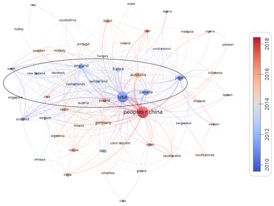 This study encompasses the literature from 73 countries and regions. Figure 4 displays a co-occurrence map of countries involved in at least five articles. In Figure 4, the size of the nodes represents the number of publications from each country or region, while the colours reflect the timeline of research, with blue indicating earlier studies and red indicating more recent ones. The connections between nodes represent the collaborative relationships between different countries or regions. Figure 4 reveals that China, the United States, Canada, Japan, France, and the United Kingdom are among the countries with a higher number of publications. Developed countries such as the United States, Canada, and Japan are among the earlier contributors to research.