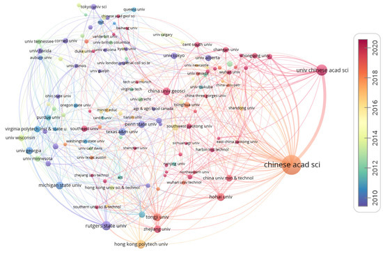 Figure 5 displays a co-occurrence map of institutions with at least ten articles. In this figure, the size of the nodes represents the number of publications from each institution, while the colour of the nodes reflects the timeline of research, with blue indicating earlier studies and red indicating more recent ones. Based on the data, Chinese academic institutions have demonstrated active research performance in this field in recent years. Prominent institutions include the Chinese Academy of Sciences, the University of Chinese Academy of Sciences, Tongji University, Zhejiang University, and Hohai University.