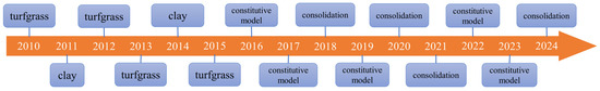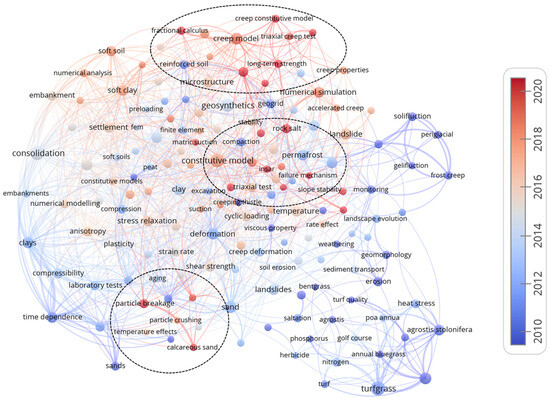 Keywords serve as highly succinct summaries of the research conducted in a paper, allowing for the precise encapsulation of the study’s content, and assisting researchers in accurately pinpointing research hotspots within specific fields. To gain a deeper understanding of the research focus and core content in this field, a co-occurrence analysis of keywords was conducted on the retrieved literature. Table 1 lists the top 20 keywords by frequency of occurrence. The summarised results indicate that soil creep primarily centres on turfgrass, consolidation, and constitutive models. Using the authors’ keywords, a co-occurrence analysis of keywords was conducted using VOSviewer, and the results are depicted in Figure 6. In the figure, blue denotes earlier occurrences, while red signifies newer ones. From the figure, it can be observed that the currently newer keywords primarily include creep model, fractional calculus, creep constitutive model, long-term strength, particle breakage, failure mechanism, and rock salt. Figure 7 illustrates the changing trends in the annual occurrence frequency of the top keywords over the last 15 years. As evident from the Figure, research before 2015 primarily focused on clay and turfgrass, while subsequent studies gradually shifted their focus towards constitutive models and consolidation. A comprehensive analysis indicates that soil creep research predominantly concentrates on establishing the deformation mechanisms and predictive models of soil creep. Through an in-depth investigation of keywords, a better understanding of the developmental trends and frontier dynamics in this field can be attained.