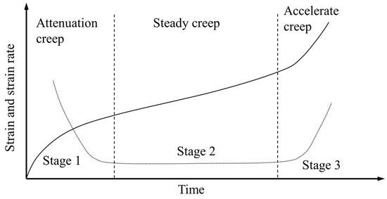 Under long-term loading, soil often exhibits creep deformation. Therefore, creep characteristics are considered to be one of the important features of soil. The deformation process of soil is considered to be a combination of reversible deformation generated by the bending and rotation of individual particles, and irreversible deformation resulting from the relative movement of adjacent particles at contact points. This relative movement between particles is regarded as a rate process. During this creep deformation process, the bonds between particles continuously fracture and recombine [15]. After creep, the number of particles and pores increases, while their diameters decrease, leading to a decrease in porosity and complexity. Currently, common creep tests include one-dimensional consolidation tests, triaxial creep tests, and shear creep tests, among others. The loading methods primarily involve single loading and step loading. Given the irreproducibility of soil sample structures, step loading is often adopted. Subsequently, analyses are conducted using the Boltzmann superposition principle or methods such as the “Chen method [16]” to obtain the strain–time relationship under different loading conditions. Based on different creep rates, creep can be divided into three stages: instantaneous creep, steady-state creep, and accelerated creep, as shown in Figure 8. In one-dimensional consolidation tests, due to the influence of lateral confinement, only instantaneous creep and decay creep occur in the soil sample. However, in triaxial shear tests, steady-state creep or even accelerated creep may occur. During the instantaneous creep stage, the deformation rate gradually decreases; during the steady-state creep stage, the deformation rate stabilizes at a fixed value; and during the accelerated creep stage, the creep rate gradually increases, indicating the failure of the soil sample.