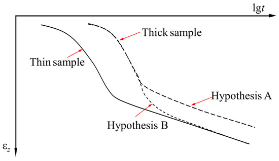 In the equation, t2 represents the end time of the test, t1 denotes the primary consolidation time; and e1 and e2 represent the void ratios at times t1 and t2, respectively. The secondary consolidation coefficient is dependent on the end time of primary consolidation and is significantly influenced by it. Casagrande proposed a widely adopted method for distinguishing primary and secondary consolidation based on one-dimensional experiments. However, this method has subjective judgmental drawbacks, leading many scholars to propose alternative methods. Yu et al. [18], starting from the soil constitutive relationships, and based on the principle that pore pressure dissipates at the end of primary consolidation and that the entire load is borne by the soil skeleton, which equates to total stress being equal to effective stress, proposed that secondary consolidation begins when the constitutive curve is linear. The Terzaghi theory suggests that deformations after the inflection point of the logarithmic time-deformation curve are primarily due to secondary consolidation deformation. Currently, there are two main hypotheses regarding the relationship between soil creep and primary and secondary consolidation. Hypothesis A considers creep deformation to be a secondary consolidation, occurring after primary consolidation, with no creep deformation during primary consolidation. Hypothesis B suggests that creep occurs throughout the entire deformation phase of the soil. Hypothesis A posits that secondary consolidation begins only after primary consolidation ends, regardless of soil thickness, attributing both primary and secondary consolidation to particle deformation and relative particle sliding. Hypothesis B argues that there exists an adsorbed water film around the soil skeleton, with the viscous action of this film operating throughout the entire consolidation process. During the dissipation of excess pore water pressure in the initial consolidation stage, there are two extreme viewpoints from Hypothesis A and Hypothesis B regarding the occurrence of creep. The predicted strain–time curves associated with hypotheses A and B are shown in Figure 9. Degago et al. [19], summarised experimental research from the previous literature and found that the compression of clay over time aligns well with Hypothesis B. However, for permeable soils such as sand, there is no distinction between Hypothesis A and Hypothesis B [14].