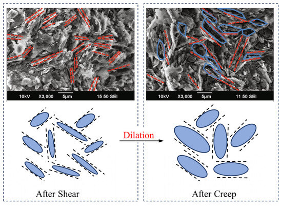 In the early 20th century, foreign scholars proposed the concept of microstructural features of soils, recognizing their significance on macroscopic mechanical behaviour, including particle size, shape, and arrangement. The particle size and shape directly influence soil hardness and viscosity. When the soil is relatively hard, excess pore water pressure dissipates more rapidly, leading to an increase in the consolidation rate [20]. As soil viscosity increases, the creep time gradually lengthens [21]. From a microstructural perspective, cohesive and non-cohesive soils exhibit different deformation mechanisms. Cohesive soils are influenced by viscosity and the soil–water system [22], while non-cohesive soils are mainly affected by particle sliding and fragmentation [23]. For the creep behaviour of soils, Pusch pointed out that its process largely depends on microstructure [24]. During soil deformation, large pores are more prone to change than small pores, and the distribution of pores gradually becomes more uniform, known as the principle of preferential deformation of large pores. The contours of particles and pores tend to become ‘smooth’, gradually assuming a flattened circular shape [25,26]. The creep process enhances the random orientation of microcracks in the soil, enlarging their length and diameter, as shown in Figure 10. The orientation of particles, pores, and their interactions significantly affect creep [27]. In soil, the sand content also affects its compressibility. When sand particles disperse within a clay–sand matrix, compressibility remains unaffected by the sand component. However, with an increase in vertical stress, sand particles coalesce to form sand clusters constituting the framework. These sand clusters absorb some stress, resulting in lower stress on the clay matrix than the surface-calculated average stress, thereby overestimating soil compressibility [28]. Moreover, an increase in organic matter content enhances soil creep deformation [29]. Soil structure also influences creep, with remoulded samples exhibiting less creep than intact samples [30]. Additionally, an increased concentration of strongly hydrophilic minerals, such as montmorillonite, in the soil tends to elevate both the water absorption rate and plasticity index, significantly enhancing the relaxation rate and creep characteristics of soil samples [31].
