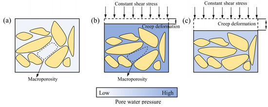 Figure 12. Diagram illustrating the evolution of microstructure during drained triaxial creep: ((a) initial state; (b) increase in pore water pressure; (c) dissipation of pore water pressure).
