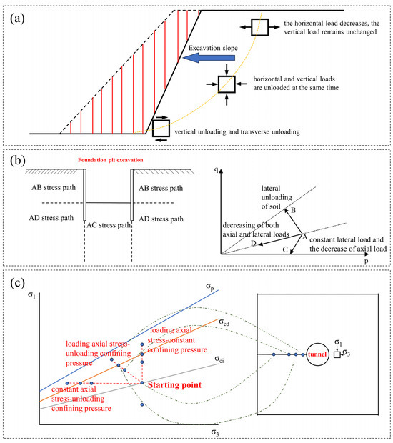Figure 13. Illustration of different engineering stress paths ((a) slope construction [69]; (b) excavation construction [70]; (c) tunnel construction [71]).