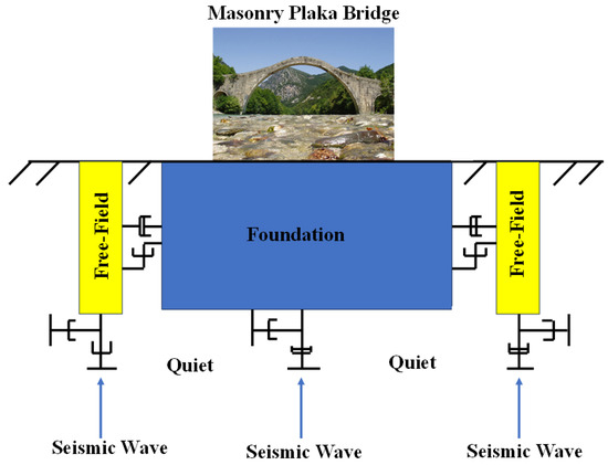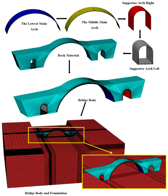 While examining historical bridges in the literature, the influence of Khorasan mortars is often disregarded. However, it is crucial to accurately model Khorasan mortars within the bridge model to yield more realistic results. Therefore, these values contribute significantly to the literature regarding the modeling of historical stone arch bridges. Subsequently, the Burger creep material model was employed for the bridge’s rockfill, arch, and foundation materials. This material model allowed for an accurate representation of the time-dependent failure behavior of the bridge material. When using this material model, the following material properties were incorporated: shear modulus, bulk modulus, density, cohesion, friction angle, and dilatancy angle values. The bridge model was constructed with a non-linear approach, employing the Burger model to characterize the non-linear behavior of materials. Additionally, free-field and quiet-boundary conditions were applied to the lateral boundaries of the three-dimensional bridge model. These boundary conditions serve to minimize the reflection of earthquake waves within the model. Furthermore, a reflecting boundary condition was specified for the base boundaries of the bridge model. The bridge model comprised a total of 1,849,274 individual brick elements. Each brick element was individually modeled within the overall structure. An overview of the three-dimensional bridge model is presented in detail in Figure 15. The height of the primary arch of the bridge was modeled as 18.7 m. Subsequently, two auxiliary arches were created, measuring 7.8 m and 8.9 m, respectively. The thickness of the primary arch section in the model was established at 0.57 m. To incorporate structure–soil interaction into the analysis of significant structures like bridges, soil was modeled beneath the bridge. Furthermore, soil was included in the bridge model to simulate a more realistic effect of earthquake waves on the bridge. Additionally, the foundation section extended downward by four times the height of the bridge (Figure 15).