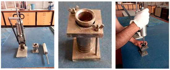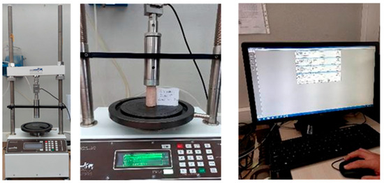 The experiments were conducted following the ASTM D2166/D2166M-16 [41] standard. The prepared samples for the test were placed on the bottom table of the automatic triaxial strength test device, as shown in Figure 6. Subsequently, relevant data concerning the sample, such as the mixing code, sample diameter, and height, were input into the program. The test specimens were set at a height of 71 mm, and the test speed was applied at a 10% strain rate (0.71 mm/min) over 10 min. The data recording rate was selected at 1 data point per second during the test. Before starting the experiment, the lower platform was raised to ensure that the sample was adequately loaded. Once the sample made contact with the upper platform and the load value exhibited a change, the load and deformation values were reset in the program, and the test was initiated. Throughout the experiments, real-time monitoring was conducted for both the graphical representation and the physical sample. Upon completion of the experiment, the stress–strain graph was generated. In this graphical representation, the maximum stress value provides the unconfined compression strength of the sample, while half of this value corresponds to the cohesion of the sample.