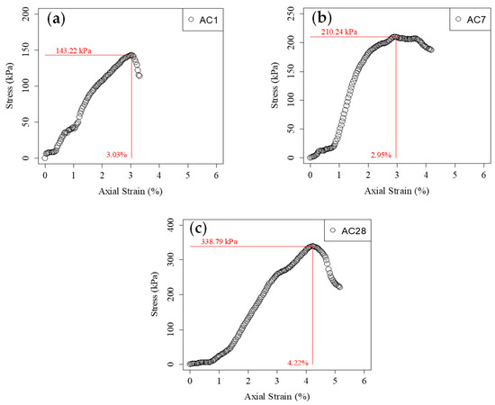 In this section of the study, the results of the unconfined compression strength test of the control sample (mortar) are presented in detail. Stress–strain graphs for the 1-day cured control sample (AC1) are provided in Figure 7a. According to the test results of the AC1 sample, the actual fracture pattern indicated a brittle fracture. When examining the stress (σ)–axial strain (ε) graph obtained from the program, it can be observed that the unconfined compression strength (UCS) of the AC1 sample was 143.22 kPa, and the sample reached the maximum stress value when the strain reached 3.03%. The stress–strain graph of the AC7 sample is presented in Figure 7b. The actual fracture pattern indicated ductile fracture, unlike the AC1 sample. The unconfined compression strength of the AC7 sample was 210.24 kPa. The axial strain value obtained at maximum stress was 2.95% and very close to the ε value of the AC1 sample. The unconfined compression strength value of the AC7 sample was 46.80% larger than AC1, demonstrating the strength-enhancing effect of the lime during the 7-day reaction period. The σ–ε graph for the AC28 sample is provided in Figure 7c. The fracture pattern was similar to AC7 but different from the AC1 sample. The unconfined compression strength of the sample was 338.79 kPa. The ε value obtained at this strength was 4.22%, slightly larger than the ε values of the AC1 and AC7 samples. The unconfined compression strength of the AC28 sample increased by 136.55% compared to the AC1, indicating that the chemical bond between lime and other materials strengthened as a result of the 28-day curing period.