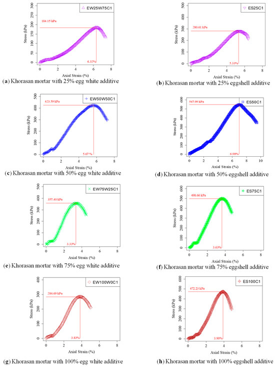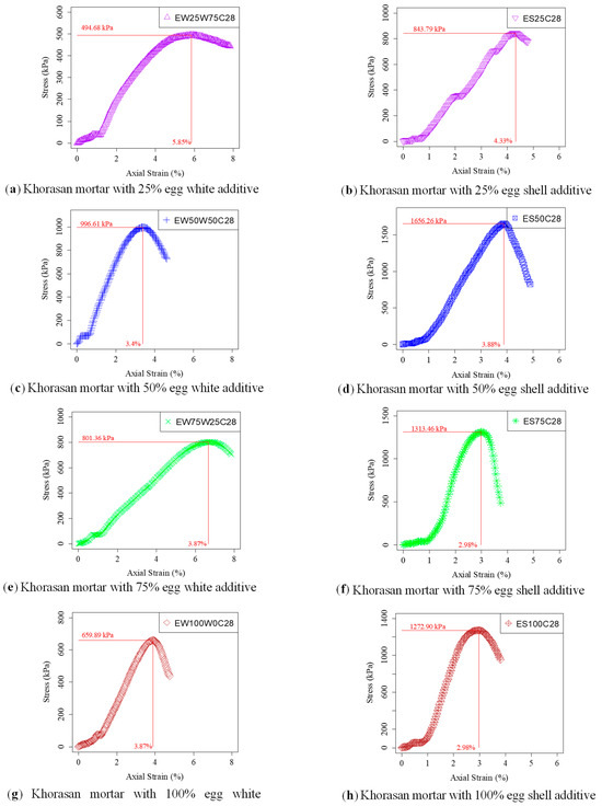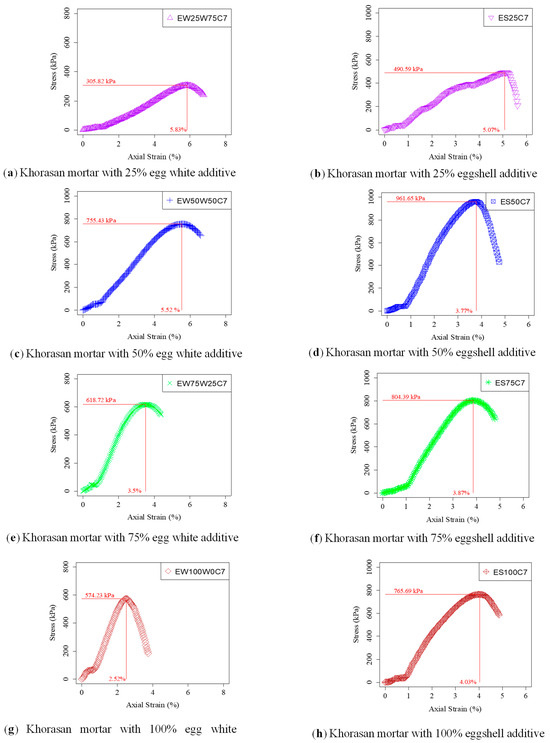 The stress–strain graph of mixtures cured for 7 days is shown in Figure 9. UCS values of all mixtures increased significantly. EW25W75C7 was the mixture having the lowest UCS value when compared to all samples cured for 7 days, as presented in Figure 9a. The behavior of the stress–strain indicates that increasing the egg white content causes a sharp reduction in the axial strain value at the point of maximum stress occurring. This value decreased suddenly after adding egg white, by more than 50%, and it is seen in Figure 9c,e,g. However, increasing egg shell content in stabilized samples caused almost no change in the axial stress value reached at maximum stress after 50%, as shown in Figure 9b,d,f,h. ES50C7 was the mixture having the highest UCS value when compared to all mixtures cured for 7 days and the increase in strength was 571.45%, according to the AC1.
