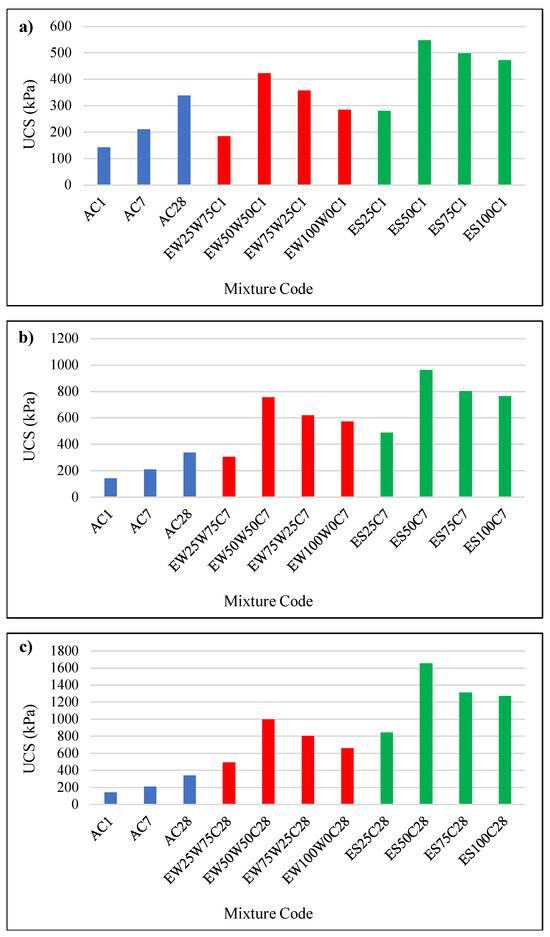 Figure 11 illustrates the unconfined compression strength (UCS) of all mixtures, including the control sample. The UCS performance of the control sample for all curing times has been depicted on the diagrams to facilitate comparison with the results of all mixtures. In Figure 11a, curing times of 1 day for all mixtures are displayed. The unconfined compression strengths of the EW50WC1, EW75WC1, ES50C1, ES75C1, and ES100C1 samples surpass those of the AC1, AC7, and AC28 samples, even though they were cured for just 1 day. Results for samples cured for 7 days are presented in Figure 11b. With the exception of EW25W75C7, all samples exhibit UCS values higher than the control sample. In Figure 11c, the UCS values of egg white-treated samples after 28 days of curing are compared. The lowest UCS among these samples is 3.45 times, 2.35 times, and 1.46 times that of AC1, AC7, and AC28, respectively, as inferred from the figure.