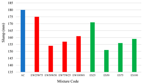 While creating mortar, slump tests are performed and the consistency of mortar is determined based on these slump tests [42]. Figure 12 illustrates the slump values of both the control sample and the mixtures utilized in the analyses. The slump value serves as a reliable indicator of workability. A notable decrease in slump was observed when a mixture with a 50% addition of eggshell was used as an additive, followed by an increase with higher ratios. A similar trend was observed in mixtures containing egg white + water. The best workability was achieved with the EW50W50 and ES50 mixtures, compared to the control sample.