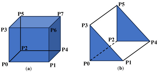 The finite-difference modeling technique offers a range of advantages that make it a valuable tool in various fields. One of its key strengths is its versatility, as it can be applied to a wide array of problems, including differential equations and partial differential equations [33]. Additionally, it is known for its simplicity, making it relatively easy to understand and implement compared to other numerical methods. Despite its simplicity, finite-difference modeling can yield accurate results when properly utilized, enabling fine-grained resolution and the capture of intricate details within the modeled system [33]. Furthermore, the method is efficient and can be deployed on modern computing architectures, resulting in high-performance simulations and reduced computational time. In this study, the FLAC3D program was employed, which is based on the finite-difference method, to develop the bridge model timeline. Each stone element was individually modeled using a separate FLAC3D code, with brick or wedge elements utilized for each stone. Essentially, our approach utilized the finite-difference method instead of the discrete-element method or finite-element method. This choice was made because the FLAC3D program and the finite-difference method offer a crucial alternative for revealing the time-dependent creep and seismic behavior of stone elements. The Plaka bridge had been destroyed and subsequently rebuilt after a flood disaster in Greece in 2015. Two distinct bridge models were developed. The first model considered the Plaka bridge, which had endured from 1866 to 2015, and utilized Khorasan mortar with egg white additives between the stone elements. On the other hand, the second model accounted for the use of eggshell-added Khorasan mortar between the discrete stone elements. In the creation of both models, each stone element was individually represented. Brick and wedge elements were employed for modeling the stone elements. Brick elements, also known as hexahedral elements, are three-dimensional elements with six faces, eight nodes, and twelve edges. They are widely used in FLAC3D to discretize the geotechnical domain and represent solid materials, such as soil, rock, or concrete [33]. In addition, wedge elements, specialized three-dimensional elements available in FLAC3D, are particularly useful for modeling geological features such as faults, joints, or stratigraphic interfaces. These elements possess a triangular base and taper to a point, resembling the shape of a wedge. Wedge elements are advantageous when modeling inclined or irregular surfaces, as they can conform well to complex geological geometries. Brick and wedge elements used in the bridge modeling process are illustrated in Figure 13.