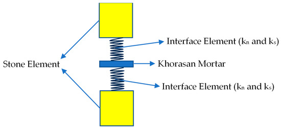 Khorasan mortar was simulated between the discrete stone elements by considering specialized interface elements. Utilizing the mechanical properties of Khorasan mortar (Figure 7, Figure 8, Figure 9, Figure 10 and Figure 11), the mechanical characteristics (kn and ks stiffness) of the interface elements between Khorasan mortar and stone elements were computed (Equation (4)) [33]. Subsequently, the calculated kn and ks stiffness values, representing Khorasan mortar between the stone elements in the bridge model, were defined to realistically model the interaction between the stones. The most straightforward approach to modeling Khorasan mortar within a three-dimensional model is to introduce interface elements into the bridge model instead of Khorasan mortar. The mechanical properties of the stiffness elements established between the stone elements instead of Khorasan mortar were entirely determined by considering Equation (4). Therefore, in this study, interface elements, as depicted in Figure 14, were defined between distinct surfaces in place of Khorasan mortar. One interface element was computed between two different stones with identical mechanical properties. However, during the bridge modeling process, it was necessary to define interface elements between stones with varying mechanical properties in certain sections of the bridge. As illustrated in Figure 14, two distinct interface elements were computed between stones with different mechanical properties, and the larger interface element between two dissimilar stones with varying mechanical properties was considered in the analyses.