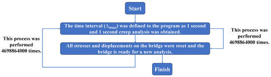 The water level at the bridge was simulated using hydrostatic water forces and a water table. During the examination of the time-dependent creep analyses, it was considered that Khorasan mortar mixed with egg white should be used between the stone elements. The primary reason for this choice is that when the bridge was constructed in 1866, Khorasan mortar with an egg white additive was employed to bond the discrete stone elements together. As egg white-mixed Khorasan mortar enhances the interaction between these stone elements, the stiffness values (kn and ks) of the interface elements were calculated, taking into account the mechanical properties of Khorasan mortar with egg white additive. The computed kn and ks values are provided in detail in Table 3. Stiffness values were established between individual stone elements, and the bridge was prepared for realistic creep analyses. In the execution of time-dependent creep analyses, specific time intervals were defined within the FLAC3D program. The definition of precise time steps is crucial for conducting more realistic analyses. To carry out the time-dependent creep analyses, we initially commenced with 1-second analyses. After each 1-second creep analysis, all stresses and displacements on the bridge were reset. Subsequently, the next 1-second analysis was conducted, and this analysis cycle was repeated 4,698,864,000 times, covering 149 years of creep analyses. The stages of analysis for the creep analyses are comprehensively presented in Figure 16.