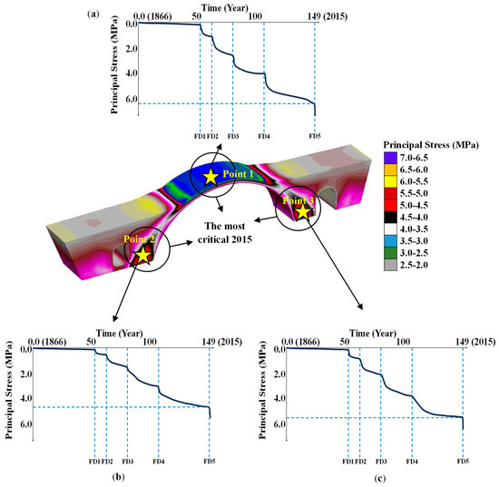 Long-term (1866–2015) principal stress behavior of the bridge containing egg white-added Khorasan mortar: (a) Point 1 (b) Point 2 (c) Point 3.
