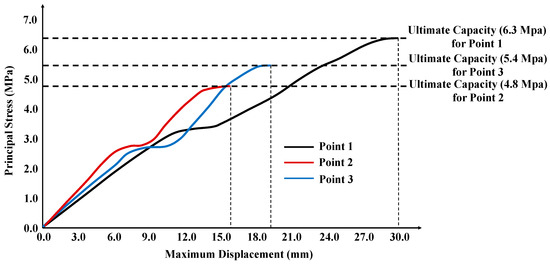In Figure 18, the stress-displacement behavior of the historical bridge is presented in detail. According to Figure 18, it was concluded that the displacement values over time at Point 1 were significantly greater than those at Point 2 and Point 3. Additionally, when comparing these three different points, it was observed that the smallest displacement values occurred at Point 2. The largest displacement value recorded at Point 1 over 149 years was approximately 29.7 mm. Furthermore, the largest displacement values observed over 149 years at Point 2 and Point 3 were 15.8 mm and 19.7 mm, respectively. Point 1, Point 2, and Point 3 reached their maximum displacement values at 6.3 MPa, 4.8 MPa, and 5.4 MPa, respectively. This result indicates that the maximum principal stress value for the structural behavior of Point 1, Point 2, and Point 3 on historical stone bridges is 6.3 MPa, 4.8 MPa, and 5.4 MPa, respectively.