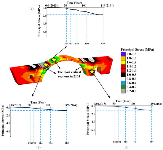 Long-term (2015–2164) principal stress behavior of the bridge containing eggshell-added Khorasan mortar: (a) Point 1 (b) Point 2 (c) Point 3.