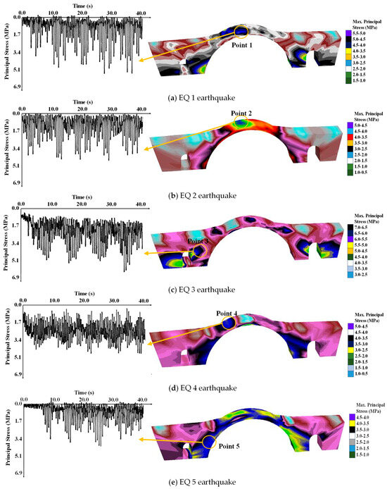 Principal stress behavior of Plaka bridge under EQ 1, EQ 2, EQ 3, EQ 4, and EQ 5 earthquakes.