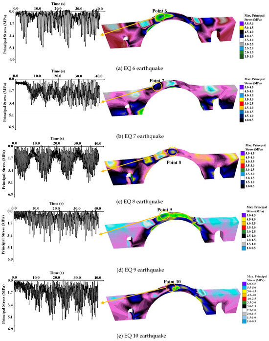 Principal stress behavior of Plaka bridge under EQ 6, EQ 7, EQ 8, EQ 9, and EQ 10 earthquakes.