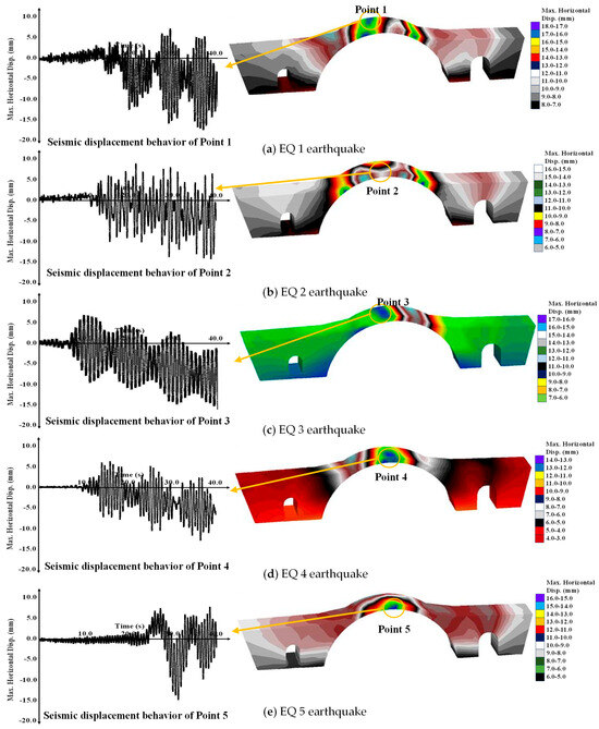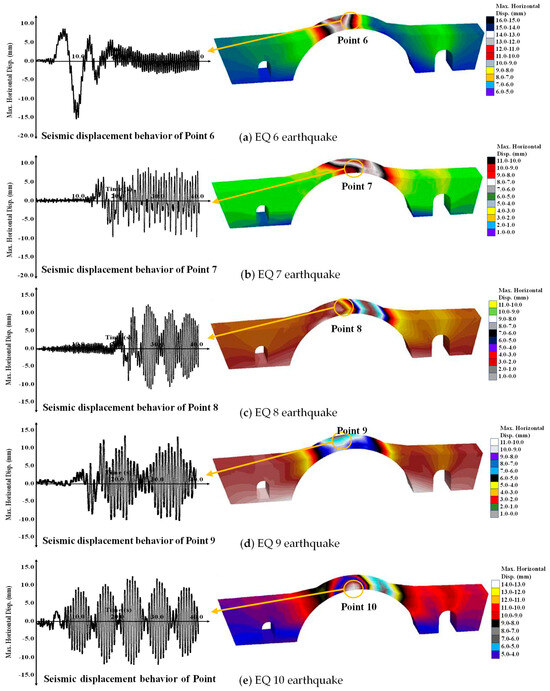 The seismic analyses in this study are based on important ground motions that occurred in Turkey in 2023, resulting in the loss of thousands of lives. Given the proximity of the Plaka bridge to Turkey, utilizing these earthquakes in three-dimensional seismic analyses holds significant importance for assessing the bridge’s earthquake response. In Figure 21, the principal stress behavior of the Plaka bridge was investigated under five different earthquakes. During the EQ 1 earthquake, substantial principal stresses were observed in the middle of the main arch section of the bridge and at the foot parts of the auxiliary arches (Figure 21a). At Point 1 on the main arch, a maximum principal stress value of 5.4 MPa was recorded during the EQ 1 earthquake. During the EQ 2 earthquake, significant principal stress values manifested in the middle and along the edges of the main arch of the Plaka bridge. Furthermore, substantial principal stress values were evident at the peripheries of the auxiliary arches (Figure 21b). Under the EQ 4 earthquake, significant principal stress values emerged at the edges of the main arch of the bridge and in the lower sections of the secondary arches. Additionally, substantial principal stresses were observed in the lower regions of the main arch. Nevertheless, no critical principal stress values were noted in the upper portions of the auxiliary arches. The maximum principal stress value recorded at Point 4 during the EQ 4 earthquake was 4.5 MPa (Figure 21d). In Figure 22, the principal stress behavior of the Plaka bridge was analyzed under five distinct earthquakes. The highest principal stress values on the bridge during the EQ 6 earthquake manifested in the upper segments of the main arch (Figure 22a). Furthermore, substantial principal stress values were observed in the lower sections of the auxiliary arches. Conversely, minimal stress values were detected at the far-right and -left extremities of the bridge. The maximum principal stress value recorded at Point 6 during the EQ 6 earthquake was 5.05 MPa. In Figure 22b, the seismic behavior of the Plaka bridge during the EQ 7 earthquake is comprehensively presented. As a result of the earthquake analysis, significant principal stress values were observed in the auxiliary arch segments of the bridge (Figure 22b). During the EQ 9 earthquake, the highest principal stress values manifested in the upper segments of the main arch section of the Plaka bridge. Additionally, notable stress values were evident in the base sections of the auxiliary arches. The maximum principal stress value recorded at Point 9 during the EQ 9 earthquake was 4.7 MPa (Figure 22d). These findings indicate that the principal stress values in the body of the Plaka bridge, restored using Horasan mortar mixed with eggshell, are lower compared to those restored using Horasan mortar mixed with egg white. This suggests that such mortars significantly enhance the seismic resilience of the Plaka bridge.