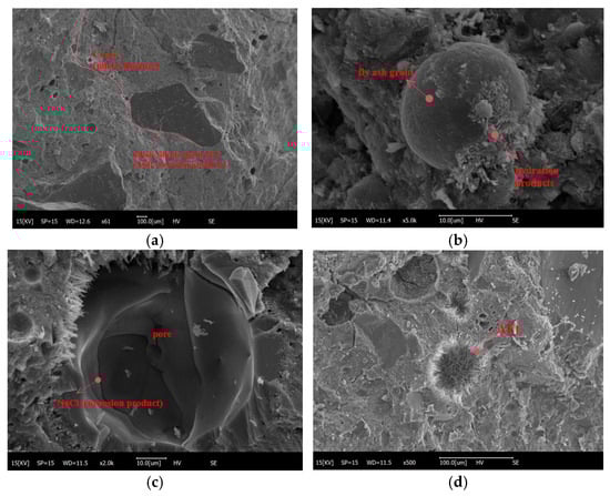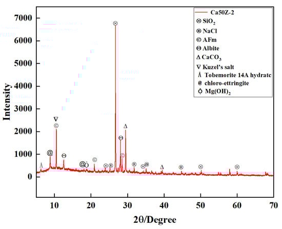 - The macroscopic observation indicates that brine corrosion does not cause significant damage to the surface of HPC. The internal damage of HPC was studied by XRD and SEM-EDS analysis of Ca50Z-2 specimens immersed in salt water for 10 years. The results showed that XRD reveals corrosion products from salt lake brine and ASR corrosion products, primarily including AFt, Kuzel’s salt, Friedel’s salt, and CSH gel. Although these corrosion products do not cause serious damage to HPC, micro-cracks are generated due to the expansion of these products. SEM-EDS microstructure images show the propagation path of micro-cracks and the formation process of mortar cracks.