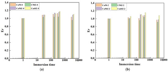- The variation in relative dynamic elastic modulus with HPC immersion time was studied. The results show that the relative dynamic elastic modulus “increases first and then decreases” with the extension of immersion time. Specifically, during the period of 0~365 days, the relative dynamic elastic modulus gradually increases by 4.01~17.36% with immersion time. From 365 days to 3650 days, the expansion of corrosion products leads to the structural damage of HPC and the formation of micro-cracks, thus reducing the relative dynamic elastic modulus, which is consistent with the results of microscopic analysis.