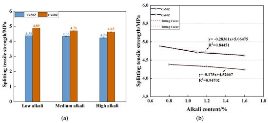 - The splitting tensile strength of HPC was analyzed. The conclusion is that under the action of 10 years of salt lake brine corrosion, the splitting tensile strength of HPC with ASR inhibition measures exhibited a trend of initially increasing and then decreasing, which is consistent with the rule of Er with immersion time. The influence of alkali content on splitting tensile strength revealed a decrease as alkali content increased. A relationship between splitting tensile strength and Er was derived through fitting analysis. This relationship also reflects the relationship between macroscopic mechanical properties and corrosion damage of HPC, which serves as a theoretical reference for obtaining the macroscopic mechanical parameters of concrete through non-destructive tests in the future.