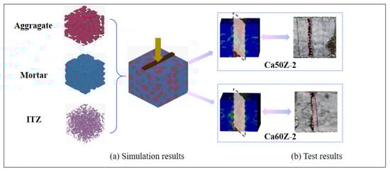 - The utilization of the 3D random aggregate mesoscopic model enables the simulation of splitting tensile mechanical properties and facilitates the analysis of internal crack propagation characteristics and failure mechanisms. Microscopic structural analysis and numerical simulation elucidate that there are still uneven ASR gel products and discontinuous fine interface cracks induced in the local area of HPC with ASR inhibition measures, which become the origin of splitting tensile failure cracks. Overall, during the splitting tensile process of concrete, mortar cracks exhibit two expansion paths. For Ca60Z-2, the proportion of coarse aggregates directly penetrated by mortar cracks is 90.3%, while the proportion of interface failures of mortar cracks bypassing coarse aggregates is only 9.7%. The data indicate that the number of coarse aggregates directly through the mortar crack is higher than the number of interface damage that occurs when the mortar crack bypasses the coarse aggregate.