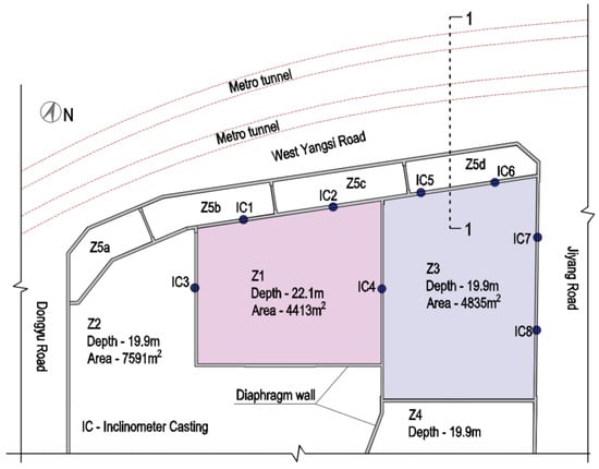 The foundation pit in this study is excavated to construct the basement of a (residential and business district) property development project in Shanghai, China. This foundation pit has a total plane area of about 58,000 m2 and a maximum excavation depth of about 22.1 m below the ground surface (BGS). In the excavation process, the foundation pit is divided into 18 subzones using diaphragm walls for sequential construction planning. In this study, the field monitoring investigation is focused on the area consisting of 8 subzones, namely Z1 to Z4 and Z5a to Z5d, as illustrated in Figure 1. The excavation depths of each subzone are as follows: Z1 area has a depth of 22.1 m BGS, Z2 to Z4 19.9 m BGS, and Z5a to Z5d about 12.4 m BGS.