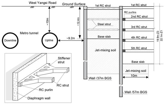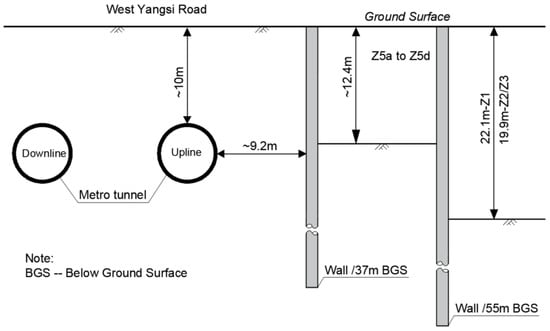 Since areas of Z5a to Z5b have much smaller excavation depths than areas of Z1 to Z3, they are divided using partition diaphragm walls and designed to have independent bracing structures, as shown in Figure 2. Notably, this foundation pit is located within the displacement-sensitive urban area in Shanghai, with many important existing surrounding facilities that need high attention. Beneath the West Yangsi Road located on the north side of the pit, two in-service metro transit tunnels exist, which are segmented bored tunnels with an outer diameter of 6.2 m, and the nearest upline tunnel is about 9.2 m distant from the external pit boundary (see Figure 1 and Figure 2). On the east side of the pit is Jiyang Road, where many municipal pipelines (energy, telecommunication, electricity) are extending beneath the road. Overall, the pit excavation encounters significant technical challenges revolving around the ground deformation control and disturbance mitigations to surrounding facilities.