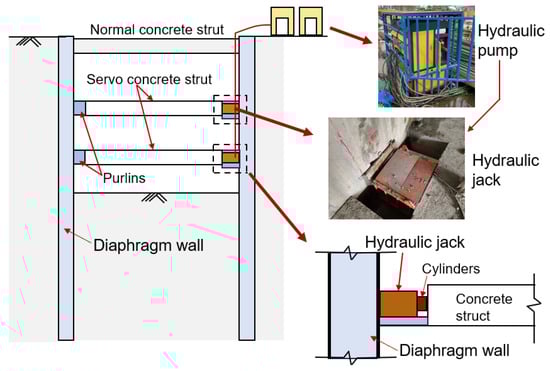 To address the defects of normal passive struts, servo steel struts have been developed and applied in foundation pit engineering. Generally, servo struts are set up by combining the normal steel struts with hydraulic jacks placed on either or both ends of the strut, and thus, the axial forces can be adjusted conveniently by setting the hydraulic pressures. The servo steel struts have been applied in many deep excavation projects and demonstrated their effectiveness in mitigating ground deformation [,,,]. However, previous studies mainly focus on developing servo steel struts, while there have been very rare studies of servo concrete struts. Considering that concrete struts are widely used especially in mega foundation pit excavations, it is technically necessary to explore applying servo technology to concrete struts.