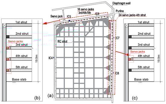 In this project, the designed servo struct is applied in foundation pit Z3, where a total of 48 hydraulic jacks are configured to the third, fourth, and fifth struts (16 jacks each) on the north side facing the West Yangsi Road (see Figure 5b), while 24 hydraulic jacks are configured to the fourth strut on the east side near Jiyan Road (see Figure 5c).