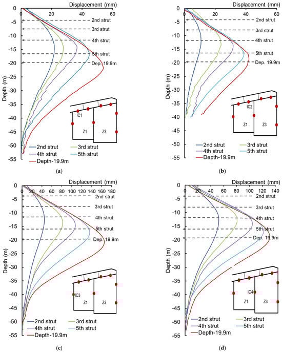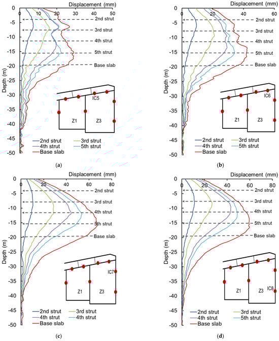 Displacement evolution at strut depths of the wall in foundation pit Z3: (a) Measurement point IC5; (b) Measurement point IC6; (c) Measurement point IC7; (d) Measurement point IC8.