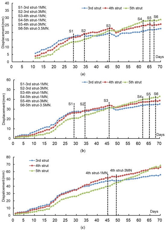 The displacement evolution tendency after imposing servo forces is the focus of this analysis. When the individual hydraulic jack at the third strut is loaded from an initial 1 MN (Meganewton) on Day 29 to a final 3 MN by Day 34, the wall displacement of IC5 (in Figure 9a) only changes from 17.3 mm to 18.7 mm in these 5 days, with an increment of 1.4 mm, whereas the wall displacement increment within the 5 days (before Day 29) is of about 2.2 mm. Furthermore, observing the displacement curves of the fourth and the fifth struts at IC5, the displacement increments are of 2.4 mm and 1.8 mm, respectively, after imposing the servo forces at the third strut, corresponding to the displacement increments of 4.0 mm and 2.8 mm at the same time-interval before. At IC6 in Figure 9b, the wall displacement shows a similar characteristic, as the servo forces tend to flatten the displacement curve and mitigate its gradient afterward.