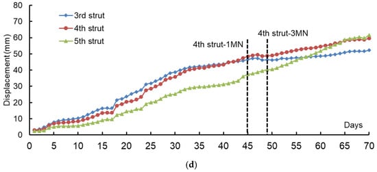 Figure 9c,d demonstrates the wall displacement measured at IC7 and IC8. The servo forces are only acting on the fourth strut, and it can be shown that the forces impose more significant effects on the third and fourth struts than on the fifth strut. The servo forces flatten the displacement curves corresponding to the third and fourth struts, and at IC7 the average daily increment of displacement was reduced from about 0.6 mm (period of Day 41–45) to 0.45 mm (period of Day 45–49) at the fourth strut, and from about 0.5 mm to 0 mm at the third strut. However, its impacts on the fifth strut seem insignificant, and comparing the displacement curves monitored on the north and east sides, it can be inferred that the servo jacks, when configured to multiple layers vertically, have a higher effectiveness in mitigating wall displacement than when to a single layer.