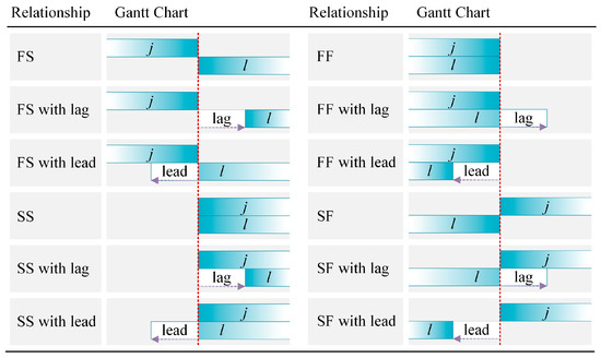The relationship between the activities can be defined in multiple forms, namely, Start to Start (SS), Start to Finish (SF), Finish to Start (FS), and Finish to Finish (FF). The various relation types can also be combined with either a lag time or a lead time for delaying or advancing the start/finish time of any immediate succeeding activity, respectively. These relationships can be formulated by modifying Equation (3) as follows: