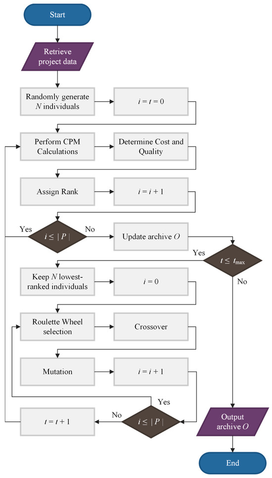 The application of the GA ranges from single- to multi-objective optimization [32], and as mentioned earlier, several efficient variants of the algorithm have been suggested in the literature. Unlike intelligent methods such as the GA, the weighted approaches and constraint methods can convert multi-objective problems into single-objective problems, which complicates locating multiple solutions at once, rendering them unsuitable for engineering applications [14,18]. NSGA-II [33] is noticeably one of the more successfully practiced intelligent methods. Akin to NSGA-II, the GA practiced in this study starts by generating a random population of size . At each iteration , Equations (1) and (10) are used to obtain the three objective function values of time, cost, and quality performance based on the modes selected and the CPM calculations performed according to Equations (12)–(15). As shown in Figure 2, solutions are then ranked based on the Pareto dominance optimality. The lowest rank of zero is assigned to the non-dominated solutions of the current population. Ranking is continued by incrementing the rank by one and assigning the new value to the non-dominated solutions among the non-ranked individuals of the current population. Assigning a larger rank to the non-ranked, non-dominated solutions continues until all the individuals are ranked. In so doing, non-dominated solutions are given greater chance to be selected in the reproduction cycles. In addition, rank zero non-dominated individuals that form the Pareto front are copied to an external archive () at each iteration. This archive is designed to hold only the Pareto individuals by identifying and discarding those being dominated by the new members of the front. The current parent population is used to generate offspring by performing roulette wheel selection, crossover, and mutation operations of the classical genetic algorithm. In the roulette wheel selection, the ranks assigned are used to control the probability of selection rather than the fitness values of the individuals. In the process of parent selection, the ranks are used as the only criterion; in case of a tie rank, an individual will be chosen randomly. Following the reproduction stage of the algorithm, lowest-ranked individuals out of solutions will be retained for the subsequent generations. The algorithm will evolve the population by repeating the same set of operations times. Ultimately, the GA will terminate and return the final Pareto solutions recorded in archive .