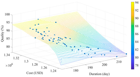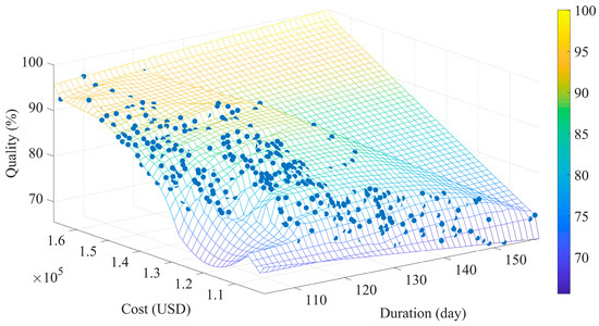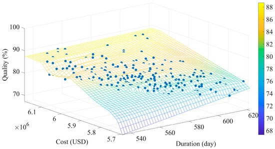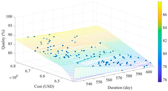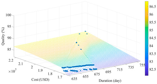 The performance of the current GA over the largest practiced TCQTP is displayed in Table 10. For the sake of brevity and clarity, only a summary of the Pareto solutions is provided in this table. The multi-objective GA was able to achieve 119 non-dominated solutions within a period of 8293 s. The approximate Pareto front spreads over a range from 635 to 761 for the duration, USD 16,619,584.63 to USD 22,231,005.16 for the cost, and 82.50% to 86.82% for the quality performance. The complete Pareto front is demonstrated graphically in Figure 7. As shown in this figure, the solutions primarily fall within a region where durations are less than 700 days. This concentration of solutions can potentially be attributed to the high rate of daily indirect costs, which leads to a significant increase in the total cost when a deadline is missed, resulting in the domination of solutions with longer durations.