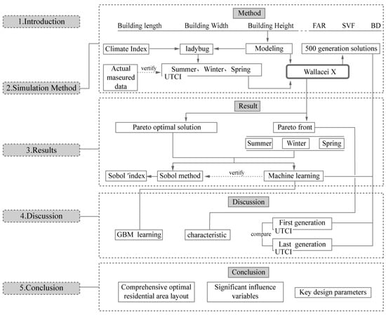 This study is mainly divided into three stages. Based on the previous climate analysis, the first stage is to build a simulation parametric model and performance simulation; the second stage is to conduct multi-objective optimization and obtain the Pareto optimal solution; the third stage adopts a machine learning method to conduct sensitivity analysis and obtain the influence degree and relationship of various physical factors on the thermal comfort of residential areas. The technical framework of this study is shown in