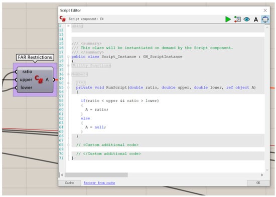 According to the “Chinese Urban Residential Area Planning and Design Standards”, the floor area ratio (FAR) for high-rise residential areas in the Yulin region (Climate Zone II) should be restricted to between 2.0 and 2.9. This threshold has been configured in the Grasshopper 1.0 with Rhino 7.24 software using C# script, ensuring that the generated models comply with the standard requirements for ground coverage area.