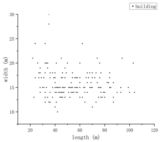 Considering the computational load and adhering to the latest Technical Regulations on Urban Planning and Management of Yulin City, which stipulate that the maximum building height for high-rise residential districts should not exceed 80 m, this study focuses on such districts. Consequently, the building height (BH) parameter is set between 24 and 80 m, and the number of floors ranges from 8 to 26, reflecting the common residential building height of approximately 3 m per floor. The dimensions of the basic unit, including length and width, are selected based on actual conditions. Analysis indicates that the building width (BW) of residential buildings in Yulin tends to cluster between 13 and 17 m. The length of most residential buildings (BL) is mainly concentrated within 80 m. Based on the land use scale of this study, the length of the building monomer is determined to be controlled within the range of 25 to 35 m.