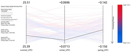 Figure 12 shows Pareto optimal solutions of the 50th generation. It can be seen that the optimization of UTCI values in summer was small, which was mainly related to the climatic conditions in the Yulin region. The climate zone of Yulin is a cool area with an average temperature of 17–30 (°C) in July. Under this temperature condition, the original UTCI value has little difference with the comfort range. Therefore, this simulation has little improvement in thermal comfort in summer. However, low temperatures and high wind speed in winter and spring in cold regions lead to a lower UTCI value in winter and spring than the comfort range. Therefore, the simulation results greatly optimize the UTCI in both winter and spring.